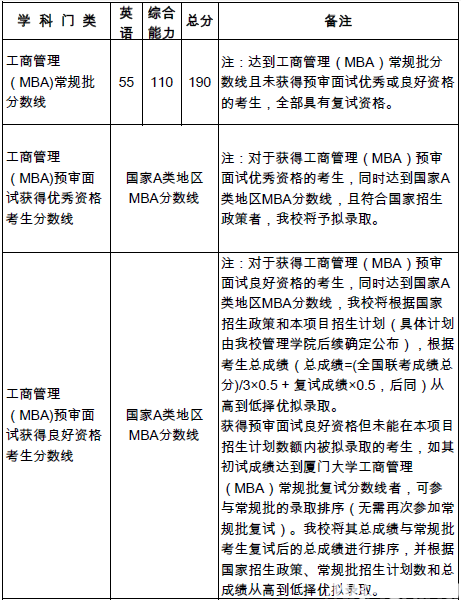 廈門大學2019年入學MBA研究生復(fù)試分數(shù)線,經(jīng)學校招生工作領(lǐng)導(dǎo)小組會議研究決定,劃分如下: