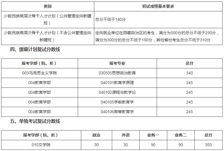 說(shuō)明:此復(fù)試基本分?jǐn)?shù)線只是我校復(fù)試的最低分?jǐn)?shù)要求,接受報(bào)考的學(xué)部院系可根據(jù)整體考試情況、招生計(jì)劃、學(xué)科專業(yè)特點(diǎn)等,上調(diào)分?jǐn)?shù)要求??忌毻瑫r(shí)達(dá)到學(xué)校復(fù)試基本分?jǐn)?shù)線和報(bào)考學(xué)部院系調(diào)整設(shè)定的復(fù)試分?jǐn)?shù)線,才有資格參加復(fù)試。學(xué)部院系調(diào)整設(shè)定的復(fù)試分?jǐn)?shù)線和復(fù)試辦法,另行通知。