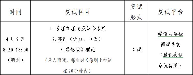 (三)復(fù)試成績(jī)以 100 分為滿分,計(jì)算方式如下:復(fù)試成績(jī)=管理學(xué)理論及綜合素質(zhì)成績(jī)×60%+英語(yǔ)(聽(tīng)力、口語(yǔ))×20%+思想政治理論成績(jī)×20%。